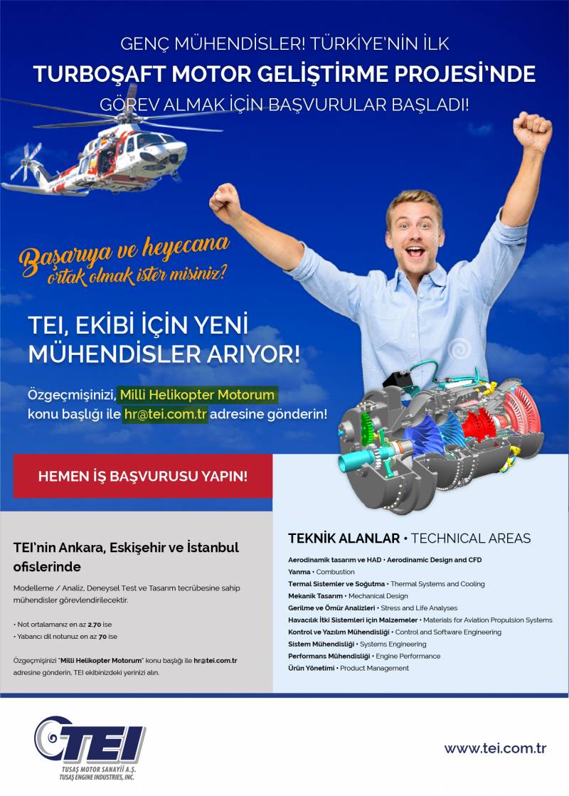 TEI TUSAŞ Motor Sanayii A.Ş. olarak, Milli Helikopter Motoru projesi için mühendis ve mühendis adayları aranıyor. Detaylı bilgiler afiştedir.